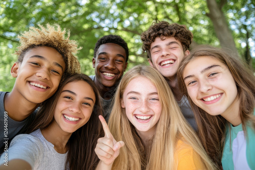 Group of cheerful teenagers smiling together outdoors under a bright sunny sky