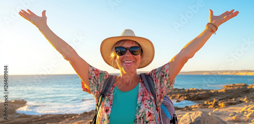 Happy woman enjoying beach vacation with arms raised in sunlight