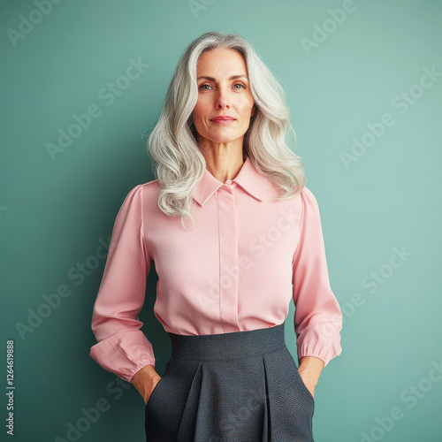 Confident Eastern European woman in her 60s posing elegantly with a calm expression in a soft pink blouse