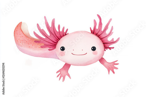 Watercolor illustration of a happy cartoon axolotl for nursery decor