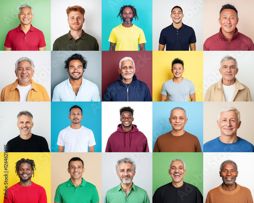 Portrait grid showcasing diverse men across various ages and before colorful backgrounds