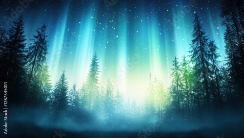Mystical aurora borealis above a dense forest under a starry night sky