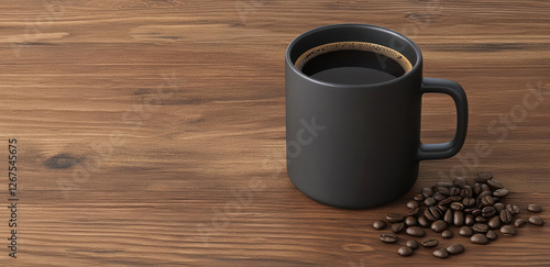 Frische Tasse Kaffee mit vielen Kaffeebohnen auf Holz