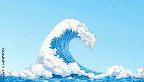 Stylized illustration of a dramatic ocean wave with blue and white hues