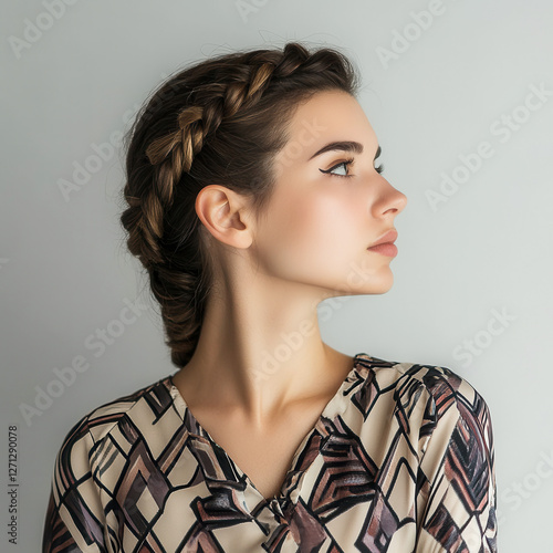 Contemplative young woman with a braided crown hairstyle gazing in the distance