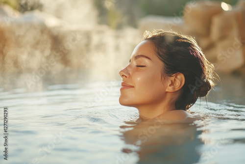 Serene Japanese woman enjoying tranquility in a steaming hot spring