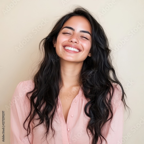 Joyful Colombian woman in her 20s with long wavy hair smiling