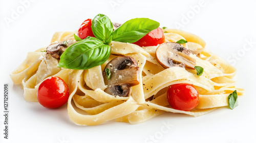 Delicious vegetarian fettuccine pasta with mushrooms, cherry tomatoes, and fresh basil