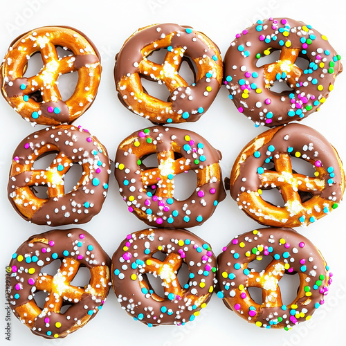 Top view of colorful chocolate-covered pretzels with sprinkles