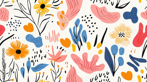 Colorful seamless abstract floral pattern with hand-drawn playful elements