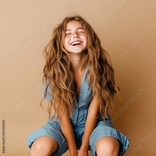 Joyful teenage girl smiling in a blue outfit against neutral background