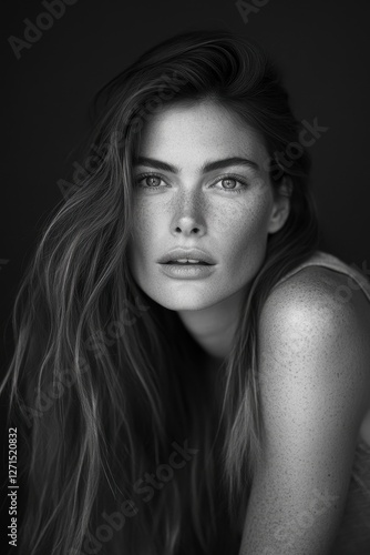 Black and white portrait of a Swedish woman with freckles and messy hair