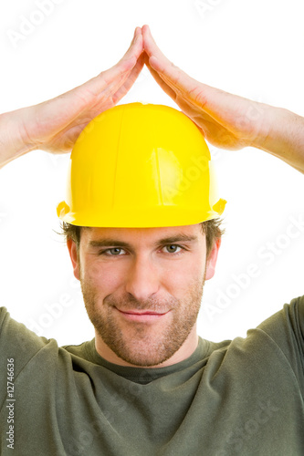 Bauarbeiter jubelt mit Schraubenschlüssel