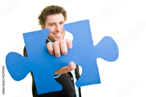 Blonde Frau im Jackett verbindet zwei große blaue Puzzleteile