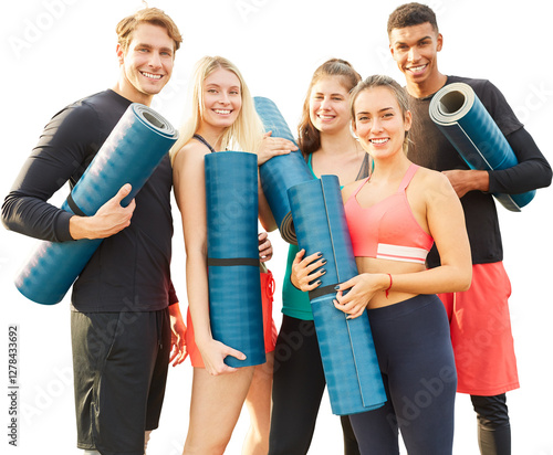 Gruppe Freunde mit Yogamatte lachen fröhlich