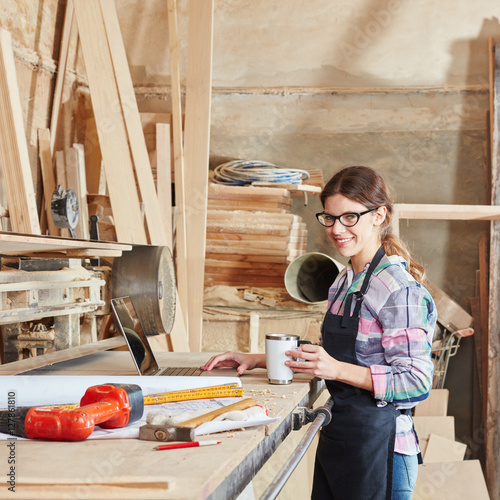 Zufriedene Handwerker Frau als Schreiner Lehrling