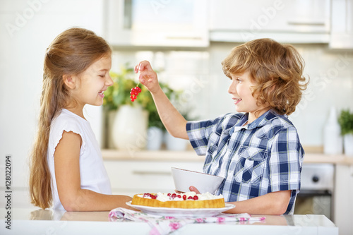 Zwei Kinder naschen vom Kuchen mit Johannisbeeren