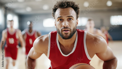 Intense basketball game captured with skilled player in red jersey dribbling in action
