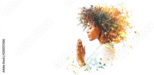 Artistic portrait of a serene woman praying with colorful watercolor effect