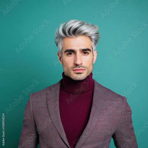 Portrait of a stylish gentleman with silver wavy hair wearing a checkered blazer and burgundy turtleneck on a teal background