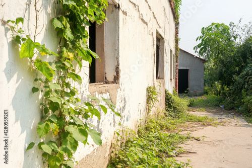 Abandoned building overgrown with vines in a sunny outdoor setting