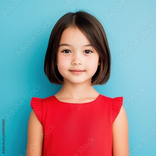 Joyful child with sleek black hair and vibrant orange shirt smiling against a bright teal background