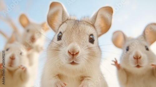 Group of curious hamsters looking down against a clear blue sky