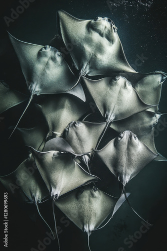 Underwater grouping of stingrays swimming together in a graceful formation