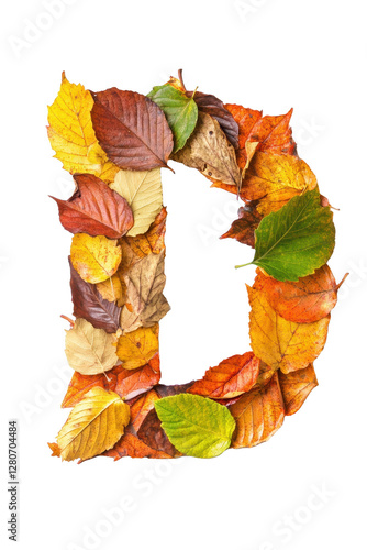 Colorful letter E made from vibrant autumn leaves isolated on white