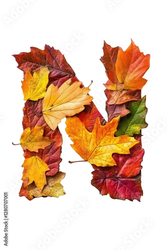 Letter N created using vibrant autumn leaves on white background