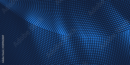 Wavy blue halftone pattern creating a flowing digital landscape with dotted grid on a blue background