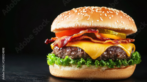 Delicious cheeseburger with bacon, vegetables, and sesame seed bun close-up