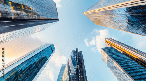 Tall skyscrapers reaching towards a bright blue sky with scattered clouds