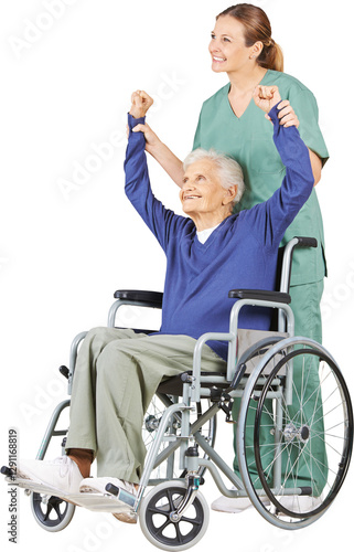 Elderly Woman in Wheelchair Doing Rehabilitation with Caregiver Assistance