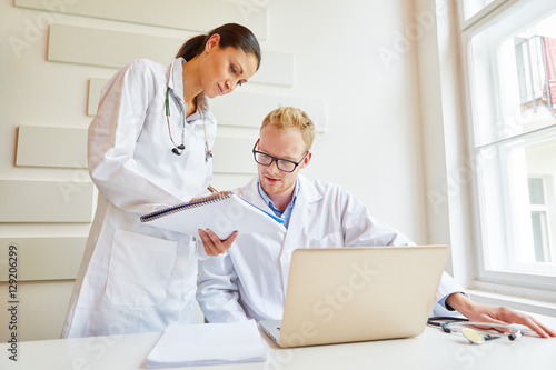 Arzt und Ärztin arbeiten mit Laptop in Praxis