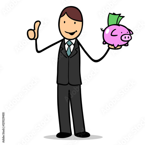 Geschäftsmann mit Sparschwein hält Daumen hoch