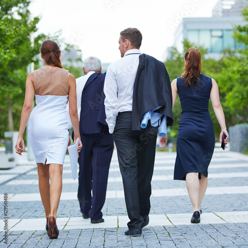 Gruppe Geschälftsleute vor dem Büro im Gehen