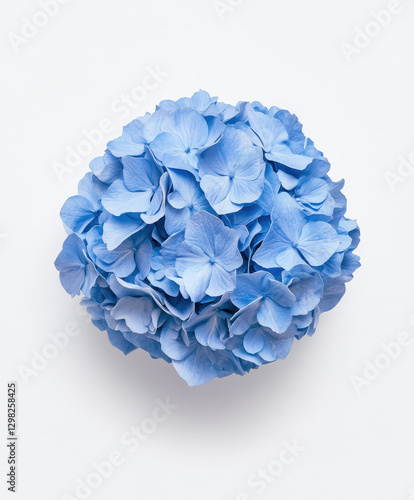 Elegant blue hydrangea blooms arranged in a round cluster on white background