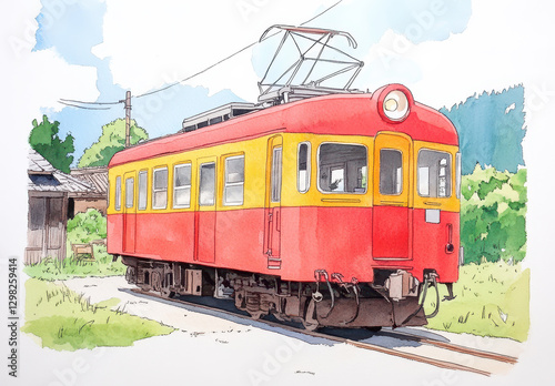 Illustrated countryside train surrounded by picturesque houses and mountain landscape