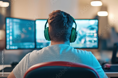 Person with headphones gaming on a computer with multiple monitors.