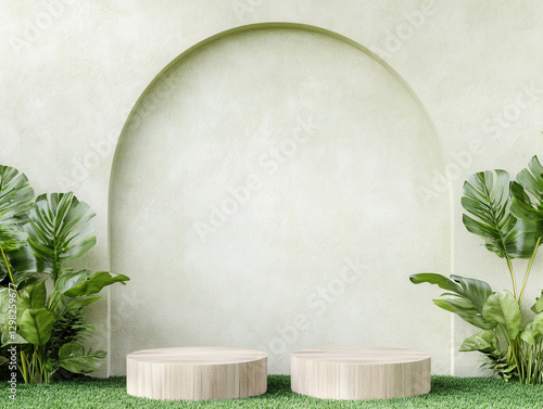 Green archway with wooden platforms and tropical foliage in a natural setting