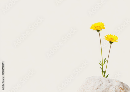 Minimalist photograph of two yellow flowers growing on a rock surface