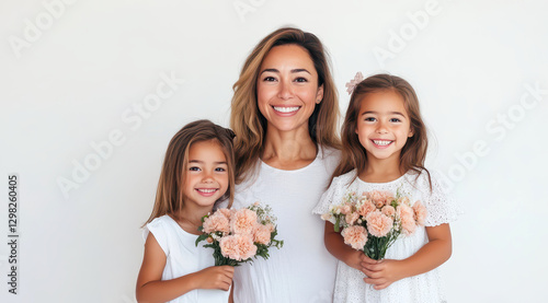 Mother with two daughters smiling and holding flower bouquets indoors