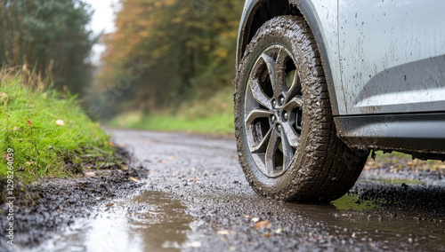 Close-up of car tire on a gravel path with blooming pink flowers in springtime sunlight
