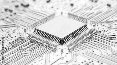 Close-up of a microchip with intricate circuit connections on a motherboard