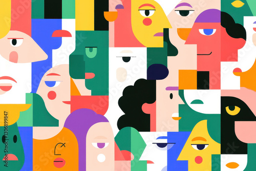 Colorful abstract illustration of diverse and vibrant faces in geometric forms