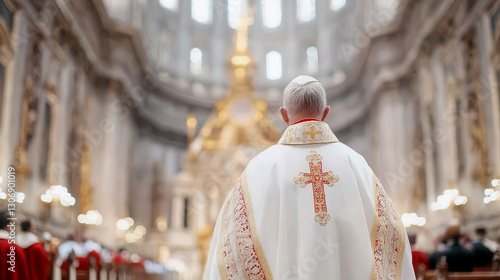 Cleric in ornate robes during a ceremony inside a grand cathedral