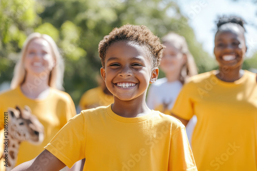 Smiling child with a group of diverse people in yellow shirts outdoors
