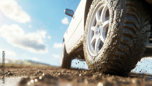 Close-up of motorcycle tire kicking up dust on a sandy road