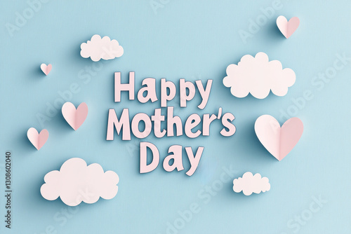 Happy Mother's Day greeting card with hearts and clouds on blue background
